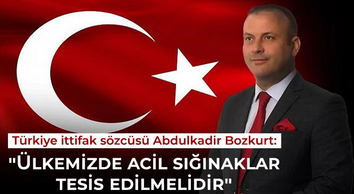 Türkiye ittifak sözcüsü Abdulkadir Bozkurt, ülkemize olası bir saldırı durumunda halkımızın güvenliği açısından her şehirde yeterince sığınaklar tesis edilmesi gerektiğini beyan ederek açıklamalarda bulundu.