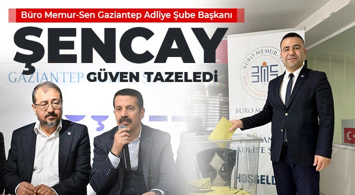 Büro Memur-Sen Gaziantep Adliye Şube Başkanı Şencay, 2. Olağan Genel Kurul’da yeniden başkan seçildi. Kongrenin divan başkanlığını yapan Memur-Sen Genel Başkan Yardımcısı Ahmet Gök, sendika binasında düzenlenen seçimin hayırlı olmasını dileyerek, “Harun kardeşimiz adli hizmet kolunda ekibiyle birlikte çok güzel çalışmalar yürüttü ve kendisi duruşuyla kişiliğiyle çok güzel bir çiziyor. Kendilerine ve yönetimini tebrik ve teşekkür ediyorum.” diye konuştu.