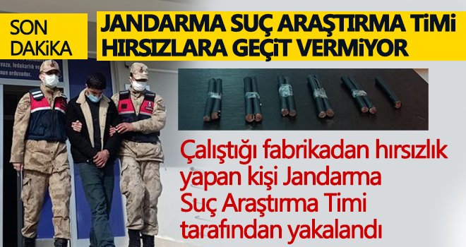 5'inci Organize Sanayi Bölgesinde bulunan bir halı fabrikasında kablo ve tesisat malzemelerinin çalınması ile ilgili şikayet üzerine jandarma çalışma başlattı. Gaziantep İl Jandarma Komutanlığı’na bağlı Jandarma Suç Araştırma Timi (JASAT) ekipleri, yaptıkları yoğun çalışma ve incelemelerin ardından şüphelinin halı fabrikasında çalışan Umut İ., olduğunu tespit etti. Takibe alınan şüpheliyi, iş yerinden çıktığı sırada durdurarak arama yapan ekipler Umut İ.'nin vücuduna bantla yapıştırılmış kabloları buldu. Gözaltına alınan ve jandarmadaki sorgulamalarının ardından adliyeye sevk edilen Umut İ., tutuklanarak ceza evine gönderildi.