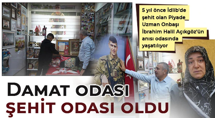Suriye'de 5 yıl önce rejim güçlerinin saldırısı sonucu 4 arkadaşıyla birlikte şehit düşen Piyade Uzman Onbaşı İbrahim Halil Açıkgöz'ün anısı, evinde hazırlanan odayla anılıyor. Yıllar önce ailesinin damat odası yapmayı düşündüğü oda şehidin eşyalarıyla donatıldı, yatağına ise ay yıldızlı albayrak serilmesi herkesi duygulandırdı.