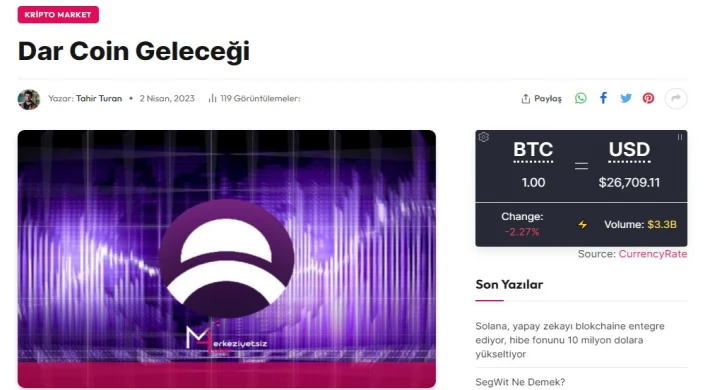 Dar Coin, blok zinciri teknolojisi üzerine inşa edilmiş merkeziyetsiz bir kripto para birimidir. Finansal işlemlerin güvenli ve şeffaf bir şekilde gerçekleştirilmesini sağlayan blok zinciri teknolojisi, Dar Coin'in temelini oluşturur. Dar Coin, merkezi otoritelerden bağımsız olarak işlem yapma imkanı sunan bir dijital para birimidir. Merkeziyetsiz Haber Sitesi olarak, kripto para dünyasında önemli bir yere sahip olan Dar Coin hakkında merak ettiğiniz detayları sizlere iletiyoruz.