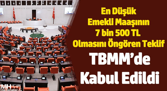 Son dakika haberine göre, en düşük emekli maaşının 7 bin 500 liraya, bayram ikramiyesinin 2 bin liraya çıkarılması ile geçici işçilere kadro düzenlemesini içeren teklif, TBMM Genel Kurulunda kabul edildi.