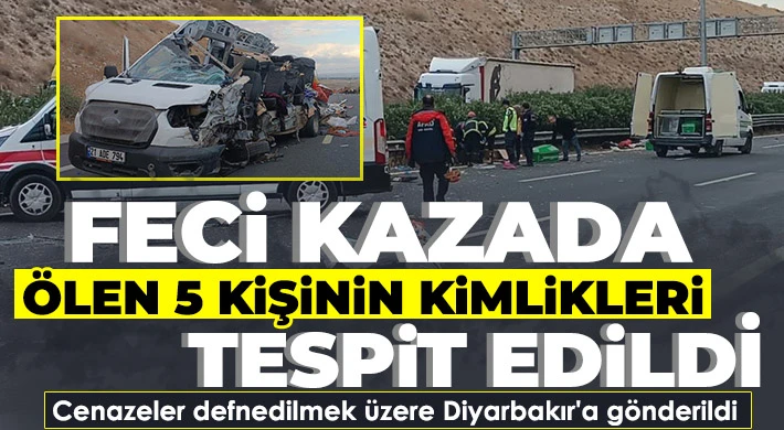 Gaziantep-Şanlıurfa Otoyolu'nda minibüsün karayolları kamyonuna çarpması sonucu meydana gelen feci kazada ölen 5 kişinin kimlik tespiti yapıldı. Cenazeler, Gaziantep'in Nizip ilçesinde tamamlanan işlemlerinin ardından defnedilmek üzere Diyarbakır'a gönderildi.