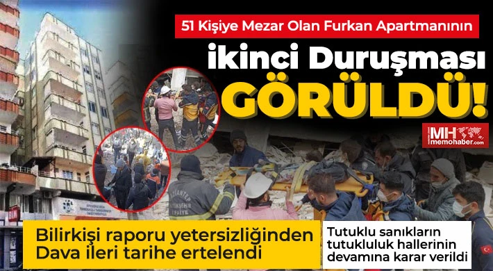 Kahramanmaraş merkezli depremlerde yıkılan ve 51 kişinin ölümüne neden olan Gaziantep’in Nizip ilçesindeki Furkan Apartmanı ile ilgili ikinci duruşma görüldü. Görülen duruşmada bilirkişi raporu yetersizliği nedeniyle Karadeniz Teknik Üniversitesi'nden bilirkişi raporunu talep edilerek duruşma 17 Ocak 2024 tarihine ertelendi.