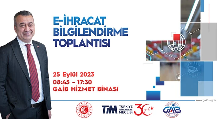 Ticaret Bakanlığı koordinasyonunda, Güneydoğu Anadolu İhracatçı Birlikleri (GAİB) ve Türkiye İhracatçılar Meclisi (TİM) E-İhracat Sekreteryası iş birliği ile 25 Eylül 2023 pazartesi günü GAİB Hizmet Binasında E-İhracat Bilgilendirme Toplantısı düzenlenecek.