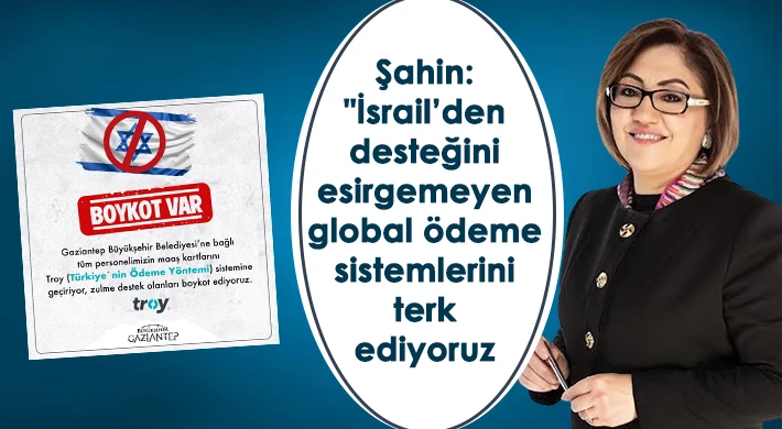 Gaziantep Büyükşehir Belediye Başkanı Fatma Şahin, İsrail'e destek veren global ödeme sistemlerini terk ederek 'Troy' olarak bilinen Türkiye Ödeme Sistemi'ne geçeceklerini açıkladı.