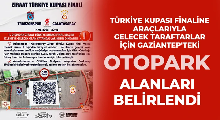 Gaziantep Emniyet Müdürlüğü, Galatasaray ile Trabzonspor arasında 14 Mayıs Çarşamba günü oynanacak 63. Ziraat Türkiye Kupası final maçına bireysel araçlarıyla gelecek taraftarlar için açıklama yaptı. Yaşanabilecek yoğunluk nedeniyle şehir girişindeki Ortadoğu Fuar Merkezi'nin bireysel araçlarla gelecek 2 takım taraftarları için park yeri olarak belirlendiği bildirildi.