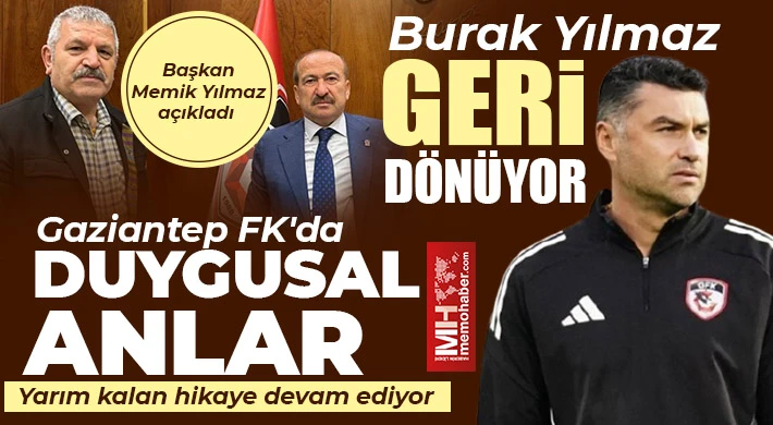 Gaziantep FK teknik direktörlğünden ayrılan Burak Yılmaz geri dönüyor. www.memohaber.com genel yayın yönetmeni Mehmet Taşçı'ya konuşan Kulüp Başkanı Memik Yılmaz, olayın bir yanlış anlaşılmadan kaynaklandığını belirterek, "Burak hoca ile konuştum, sorun çözüldü. Birlikte oruç tuttuk, bayramı da birlikte yapacağız" dedi.