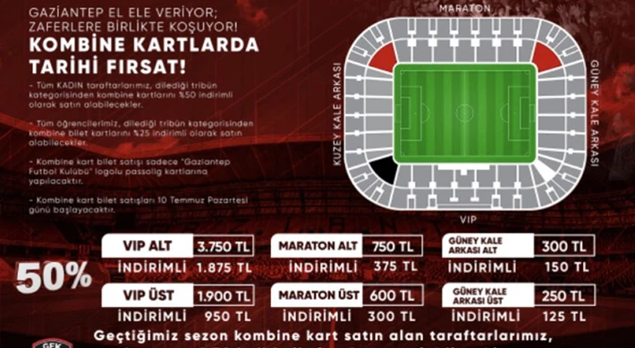 Süper Lig’de şehrimizi temsil edecek olan Gaziantep Futbol Kulübü yeni sezonda oynayacağı karşılaşmaların sezonluk kombine bilet fiyatları belli oldu.