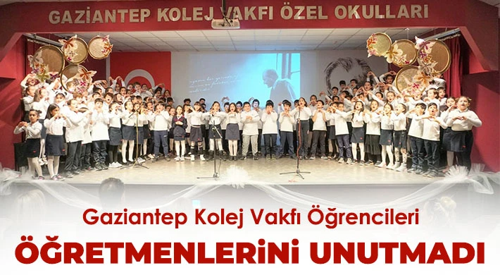 24 Kasım öğretmenler günü etkinlikleri kapsamında Gaziantep Kolej Vakfı Özel İlkokulu öğrencileri tarafından hazırlanan etkinlik öğretmenleri duygulandırdı. Öğrencilerden oluşan koro öğretmen konulu bir birinden güzel parçaları seslendirirken drama gösterileri ayakta alkışlandı.