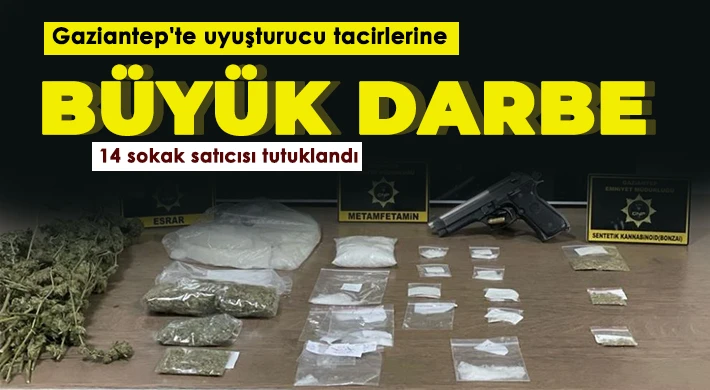 Gaziantep Emniyet Müdürlüğü'ne bağlı Narkotik Suçlarla Mücadele Şube Müdürlüğü ekipleri, Cumhuriyet Başsavcılığı koordinesinde sokak satıcısı olarak tabir edilen uyuşturucu tacirlerine yönelik çok sayıda operasyon yaptı. Yapılan operasyon neticesinde sokak satıcısı olduğu belirlenen 14 şüpheli şahıs yakalandı. Şahısların adreslerindeki aramalarda ise 1 kilo 122 gram metamfetamin, 290 gram esrar, 8 gram sentetik kannabinoid, 1 adet ruhsatsız tabanca ile 1 adet hassas terazi ele geçirildi.