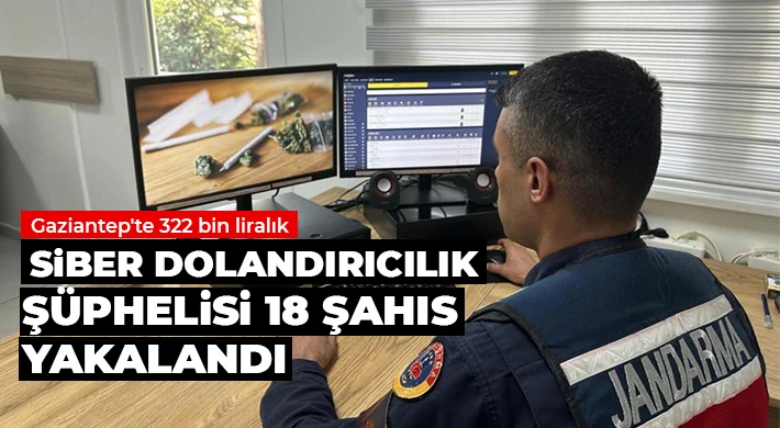 Gaziantep İl Jandarma Komutanlığı ve Cumhuriyet Başsavcılığı koordinesinde siber dolandırıcılık olaylarının önlenmesine yönelik çalışma yapıldı. Nisan ayında yapılan çalışmalarda, internet sitelerinde araç satış ilanları vermek, telefon satmak, çeşitli ev eşyaları satmak ve icra dosyasının kapatılması vaadiyle 9 vatandaşı toplam 322 bin 500 TL dolandıran 18 şüpheli şahıs yakalandı. Şüphelilere ait adreslerde yapılan adli arama sonucunda ele geçirilen dijital materyallere ve telefonlara el konuldu.