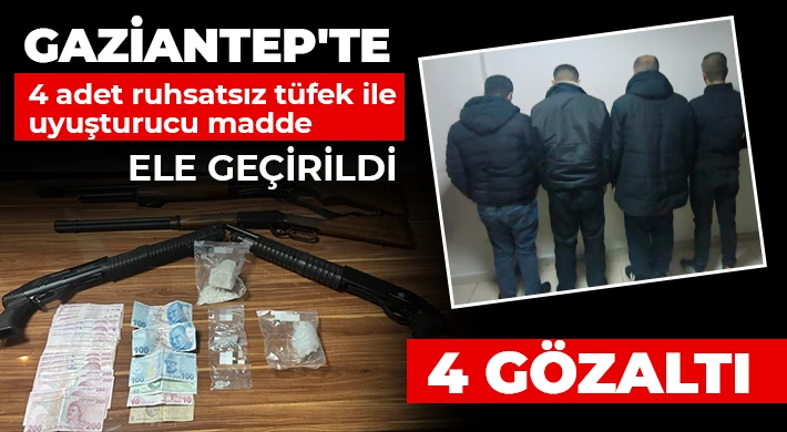 Gaziantep'te polis ekiplerinin çalışmaları sonucu 4 adet ruhsatsız tüfek ile bir miktar uyuşturucu madde ele geçirildi, 4 şüpheli yakalandı.