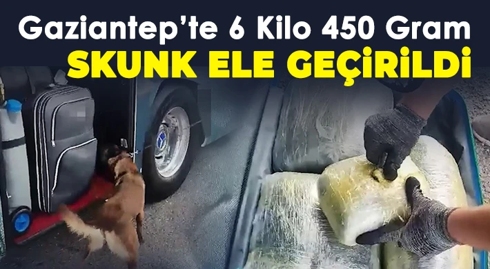 Gaziantep İl Emniyet Müdürlüğü Narkotik Suçlarla Mücadele Şube Müdürlüğü ekipleri, şüphe üzerine uygulama noktasında durdurduğu otobüste valiz içerisinde gizlenmiş 6 kilo 450 gram skunk maddesi ele geçirdi. Olay ile ilgili 1 şüpheli yakalanarak hakkında yasal işlem başlatıldı.