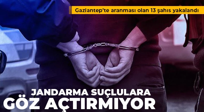 Gaziantep İl Jandarma Komutanlığı, aranan şahısların yakalanmasına yönelik son bir hafta içerisinde il genelinde Cumhuriyet Başsavcılığı koordinesinde çalışma yapıldı. Yapılan çalışma neticesinde Nurdağı, Nizip, Şahinbey, Şehitkamil ve Oğuzeli ilçelerinde narkotik, hırsızlık, yağma, ruhsatsız silah taşıma, kaçakçılık, çocuğun cinsel istismarı olmak üzere toplam 13 şüpheli şahıs yürütülen titiz planlama takip ve çalışmalar sonucu yapılan operasyonlar neticesinde yakalanarak gözaltına alındı. Şüpheli şahısların tamamı sevk edildiği adli makamlarca tutuklanarak cezaevine gönderildi.