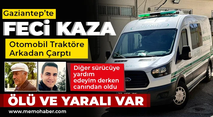 Gaziantep'te otomobilin traktöre arkadan çarpması sonucu otomobil sürücüsü hayatını kaybederken kendisine çarpan sürücüye yardım için traktöründen inen şahsa ise başka bir araç çarptı. meydana gelen kazada traktör sürücüsü ve otomobil sürücüsü hayatını kaybederken, 1'i ağır 3 kişi ise yaralandı.