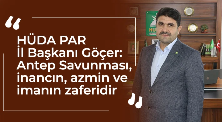 HÜDA PAR Gaziantep İl Başkanı Faruk Göçer, “Antep Savunması, ‘Şehitlik bizim için en büyük zaferdir. Şehitlik zelil bir şekilde ölmekten çok daha üstündür’ diyerek kahramanca direnerek şehit olanların ve zulme teslim olmayanların zaferidir.” dedi.