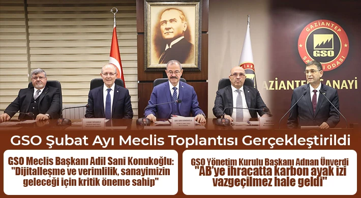 Gaziantep Sanayi Odası (GSO) Şubat Ayı Meclis Toplantısı, GSO Onursal Başkanı Abdulkadir Konukoğlu’nun katılımıyla, Meclis Başkanı Adil Sani Konukoğlu’nun başkanlığında, Yönetim Kurulu Başkanı Adnan Ünverdi, Meclis ve Meslek Komite Üyelerinin katılımıyla yapıldı.