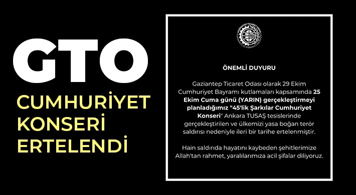 Gaziantep Ticaret Odasından yapılan açıklamada, "Oda olarak 29 Ekim Cumhuriyet Bayramı kutlamaları kapsamında 25 Ekim Cuma günü gerçekleştirmeyi planladığımız 45'lik Şarkılar Cumhuriyet Konseri Ankara TUSAŞ tesislerinde gerçekleştirilen ve ülkemizi yasa boğan terör saldırısı nedeniyle ileri bir tarihe ertelenmiştir. Hain saldırıda hayatını kaybeden şehitlerimize Allah'tan rahmet, yaralılarımıza acil şifalar diliyoruz" denildi.