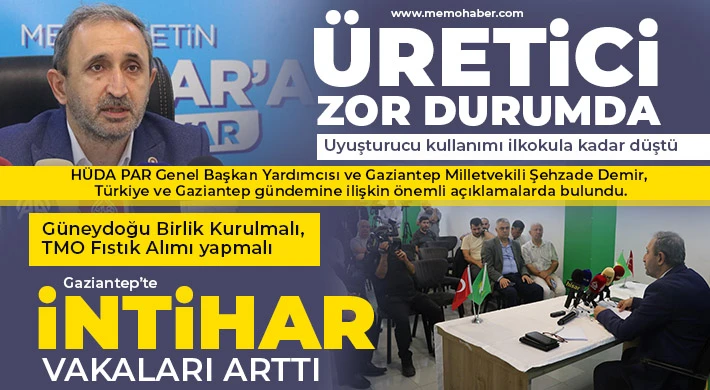 HÜDA PAR Genel Başkan Yardımcısı ve Gaziantep Milletvekili Şehzade Demir, Türkiye ve Gaziantep gündemine ilişkin önemli açıklamalarda bulundu. Gaziantep’te uyuşturucu sorunu ve intihar vakalarının arttığını kaydeden Demir, üreticilerin sorunlarının da arttığını söyledi.