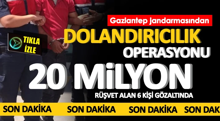 Gaziantep İl Jandarma Komutanlığınca, dolandırıcılık olaylarının önlenmesine yönelik adli makamların koordinesinde yürütülen titiz planlama, takip ve çalışmalar sonucunda, hazine arazilerinin imara açılacağı vaadiyle çok sayıda vatandaştan yaklaşık 20.000.000 TL (Yirmi Milyon TL) para toplayarak örgütlü bir şekilde rüşvet ve nitelikli dolandırıcılık suçunu işleyen şahıslara yönelik, 08.06.2023 günü Gaziantep ilinde farklı adreslerde eş zamanlı yapılan operasyonda (6) şüpheli şahıs gözaltına alınmıştır. Şüphelilerin ikametlerinde ve işyerlerinde yapılan aramalarda;