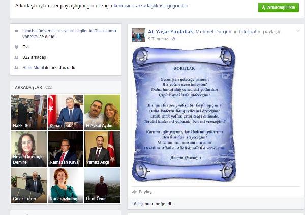 Bu arada, Ali Yaşar Yurdabak'ın 9 Temmuz'da Facebook hesabından helikopter kazasında yaşamını yitiren BBP Genel Başkanı Muhsin Yazıcıoğlu'nun şiirini paylaştığı görüldü. Paylaşımdaki şiir şöyle: