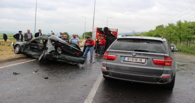 Mutlu YUCA/BOLU, (DHA) - BOLU'da, fabrikasından çıktıktan sonra kavşaktan D-100 karayoluna girmeye çalışan işadamı Hasan Ali Şenyürük yönetimindeki otomobile, hızla gelen cip çarptı. Hurdaya dönen otomobildeki işadamı Şenyürük yaşamını yitirdi, 2 kişi de yaralandı.