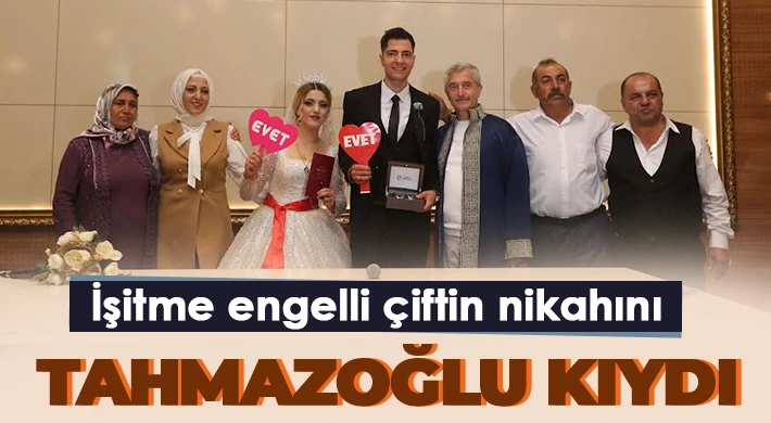 Şahinbey İlçesi’nde yaşayan işitme engelli Serdar Sevenler ile Emine Bozkurt çifti nikâh akdini yerine getirmek için Şahinbey Belediyesi Nikâh Müdürlüğüne başvuruda bulundu. Genç çifti bu mutlu gününde yalnız bırakmayan Şahinbey Belediye Başkanı Mehmet Tahmazoğlu, çiftin nikâhını kıyarak mutluluklarına ortak oldu. İşitme engelli Serdar Sevenler ile Emine Bozkurt, Başkan Tahmazoğlu’nun “Birbirinizle evlenmek istiyor musunuz” sorusuna üzerinde EVET yazılı kâğıtları kaldırarak cevapladılar.