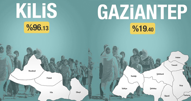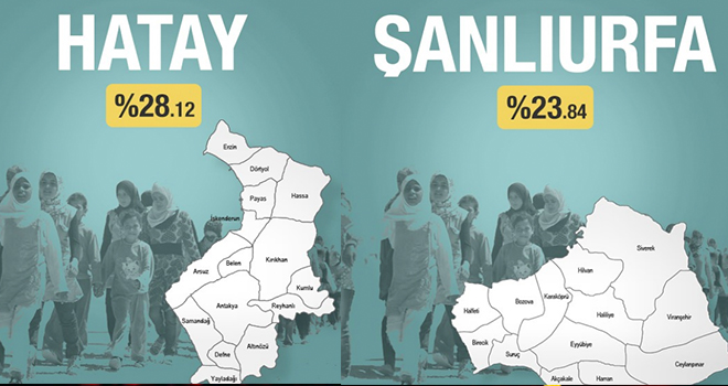 Yayınlanan istatistikte rekor sayıda Suriyelinin bulunduğu il Kilis (96.13) , Sınır illerimizden Hatay'da nüfusun yüzdelik oran 28.12, Şanlıurfa'da % 23.84 dördüncü sıra Gaziantep'in nüfus oranının yüzde 19.44'ını oluşturuyor. En az sayıda Suriyelinin bulunduğu il ise, Artvin (0.04) oldu.