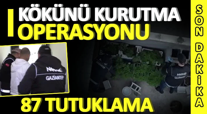 Gaziantep Emniyet Müdürlüğü'nün narkotik suçlarla mücadele çerçevesinde başlattığı 49'uncu Kökünü Kurutma Operasyonu çerçevesinde gözaltına alınan 108 şüpheli şahıstan 87'si tutuklandı.