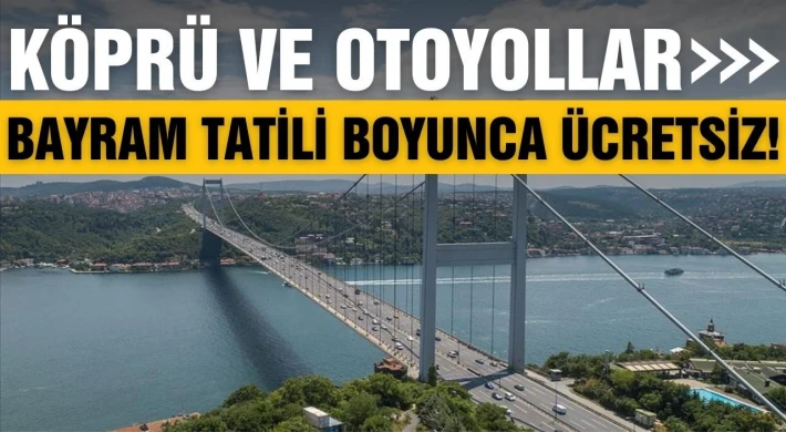 Buna göre, bayram tatili dolayısıyla KGM'nin sorumluluğu altında bulunan otoyollar ile 15 Temmuz Şehitler ve Fatih Sultan Mehmet köprüleri, ücretsiz hizmet verecek.