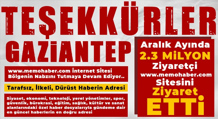 Teşekkürler Gaziantep, Teşekkürler Türkiye. Aralık ayında 2.3 milyon okuyucu haberin lideri www.memohaber.com' u ziyaret etti.