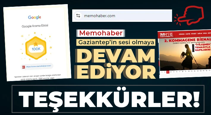 Gaziantep’te son dönemde elde ettiği başarılar ve doğru, ahlaklı ve dürüst habercilik olarak okuyucuları ile buluşan www.memohaber.com son 28 günlük dönem içerisinde haber yaptığı bölge içerisinde Google Arama motorunda aldığı 100k sınırı ile yine gündemde kalmaya devam etti. Ayrıca Sosyal medya platformunda geniş bir kitleye hitap eden haber sitesi burada da ülke genelinde yaklaşık 2 milyon kişiye hitap ediyor.