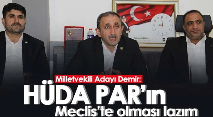 Cumhurbaşkanı Recep Tayyip Erdoğan'ın kendilerine ittifak teklifinde bulunduğunu hatırlatan Demir, "Artık HÜDA PAR'ın Türkiye siyasetinde; bu güzel programıyla, Müslüman kimliğiyle, cesaretiyle artık Türkiye'nin gündeminde ve Meclis'te olması lazım. Hepimizin böyle bir harekete, böyle bir mücadeleye ihtiyacımız var. Kendimiz için değil memleketimiz için HÜDA PAR’ın Meclis’te olması lazım.” şeklinde konuştu.