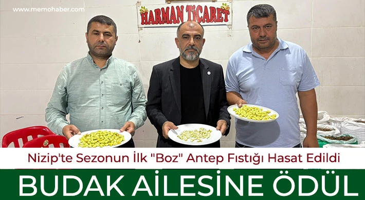 Nizip Belediyesi Fıstıkçılar Sitesi'nde düzenlenen törende, sezonun ilk yaş boz fıstığını getiren üreticiler için ödül töreni gerçekleştirildi. Nizip Belediyesi Fıstıkçılar Sitesi Başkanı Harun Bozkurt tarafından verilen çeyrek altın ödülüyle Budak ailesinin emeği takdir edildi.