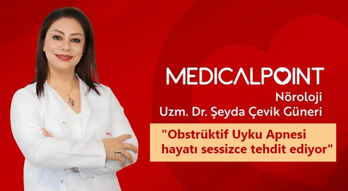 Medical Point Gaziantep Hastanesi Nöroloji Uzmanı Uzm. Dr. Şeyda Çevik Güneri, obstrüktif uyku apnesinin genellikle yüksek sesli horlama, gece boyunca nefesin durması, ani uyanmalar ve sabahları yorgun uyanma gibi belirtilerle kendini gösterdiğini belirtti.