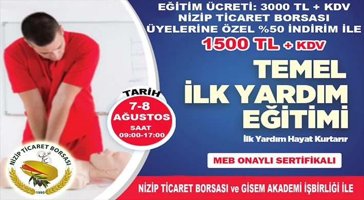 7-8 Ağustos Perşembe, Cuma tarihlerinde Nizip Ticaret Borsasında Temel İlkyardım Eğitimi düzenlenecektir. Eğitimler 09.00 – 17.00 saatlerinde arası yapılacak olup, ikinci günün sonunda sınav yapılacaktır. Sınavda başarılı olanlara sertifika verilecektir.