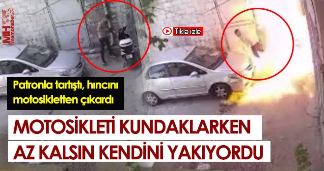 Gaziantep’te patronuyla tartışan bir işçi hıncını arkadaşının motosikletinden çıkardı. Tartışmayı yatıştıran arkadaşının motosikletini benzin dökerek ateşe veren işçinin alevlerin arasında kaldığı anlar kameraya yansıdı.