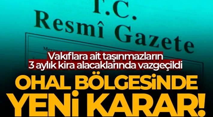 Resmi Gazete’de yayımlanan Cumhurbaşkanlığı Kararnamesine göre OHAL ilan edilen illerde bulunan ve Mülkiyeti Vakıflar Genel Müdürlüğü ile mazbut vakıflara ait taşınmazların 2023 yılı Şubat Mart Nisan ayı kira alacaklarından vazgeçildi.