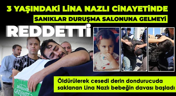 Gaziantep'te darp edilerek öldürülen ve cesedi derin dondurucuda bulunan 3 yaşındaki Lina Nazlı Erbay'ın katil zanlıları duruşma salonuna gelmeyi reddedip SEGBİS ile hakim karşısına çıktı. Sanıkların tutukluluk halinin devamına karar veren mahkeme, duruşmayı 7 Kasım'a erteledi.