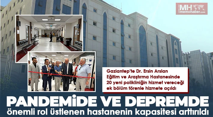 Tüm dünyayı etkileyen pandemi sürecinde ve asrın felaketi olarak nitelendirilen Kahramanmaraş depremlerinde bölgede önemli rol üstlenen sağlık kuruluşlarından olan Dr. Ersin Arslan Eğitim ve Araştırma Hastanesinin Mücahitler Ek Binasında yeni bölüm oluşturularak kapasitesi arttırıldı. Hayırseverlerin desteği ile yapılan 20 yeni ek poliklinik, düzenlenen törenle hizmete açıldı.