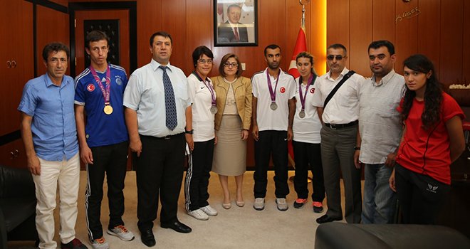 Gaziantep Görme Engeliller Spor Kulübü Başkanı Mehmet Atılgan ile Dünya ve Avrupa Atletizm şampiyonalarında dereceye giren görme engelli sporcular, Gaziantep Büyükşehir Belediye Başkanı Fatma Şahin’i ziyaret etti.