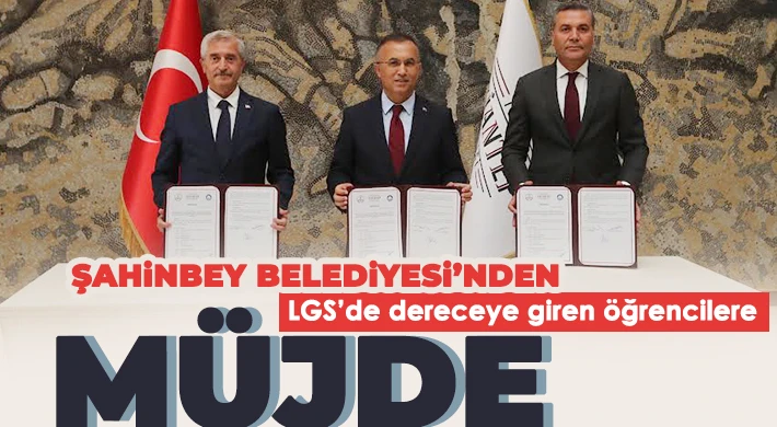 Şahinbey Belediye Başkanı Mehmet Tahmazoğlu, Gaziantep Valisi Kemal Çeber ve Gaziantep İl Milli Eğitim Müdürü Yasin Tepe ile LGS'de yüzde 1'lik dereceye giren Şahinbeyli öğrencilere 6 bin 400 TL destekte bulunmak için protokol imzaladı.