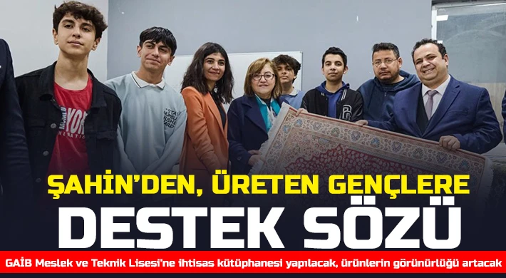 Gaziantep Büyükşehir Belediye Başkanı Fatma Şahin, GAİB Mesleki ve Teknik Anadolu Lisesi öğrencilerinin ürettiği halıların daha fazla görünürlüğünü sağlaması ve satış kolaylığı için destek sözü verdi, okula ihtisas kütüphanesi kurulacağını müjdeledi.