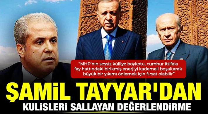 Eski AK Parti milletvekili Şamil Tayyar, sosyal medya hesabında yaptığı paylaşımda, “MHP’nin sessiz külliye boykotu, cumhur ittifakı fay hattındaki birikmiş enerjiyi kademeli boşaltarak büyük bir yıkımı önlemek için fırsat olabilir” ifadesini kullandı. “Belki küçük bir molaya, biraz duraksayıp nefes almaya, yakın geçmişi muhasebeleştirip güven tazelemeye ihtiyaç var” diyen Tayyar, MHP Genel Başkanı Devlet Bahçeli ve parti yönetiminin Kıbrıs’tan çözüm sürecine, atamalardan İstanbul soruşturmalarına kadar “olaylar dizisi” nedeniyle rahatsızlık duyduğunu söyledi.
