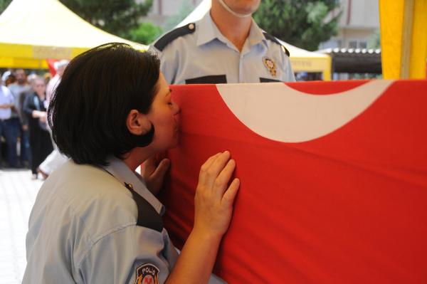 İzmir’in Konak İlçesi’nde trafik akışını düzenlediği sırada motosikletin çarpmasıyla şehit düşen 33 yaşındaki polis memuru Sabri Emir, memleketi Gaziantep’in Araban İlçesi’nde son yolculuğuna 3 bin kişi tarafından uğurlandı. Törene polis üniformasıyla katılan Özlem Emir, şehit eşinin tabutunu öperek gözyaşı döktü.