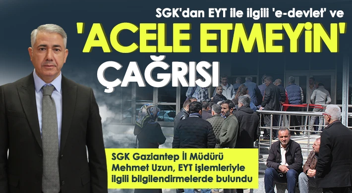 SGK Gaziantep İl Müdürü Mehmet Uzun, EYT işlemlerinin sıra beklemeye gerek kalmadan e-devlet üzerinden de kolaylıkla yapılabildiğini hatırlatarak acele etmeye gerek olmadığını belirtti. Uzun, “EYT yasası bugün Resmi Gazete'de yayımlanarak yürürlüğe girdi. İlk gün olması nedeniyle vatandaşlarımızın da yoğun bir başvuru talebi var. Vatandaşlarımıza e-devlet üzerinden de başvuru yapılabileceğini tavsiye ediyoruz. Bu şekilde işlemler sıraya girmeden ve izdihama sebebiyet vermeden daha kolay yapılabilir” dedi.