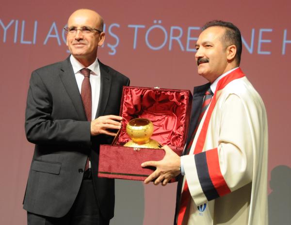 Akademik yıl açılış törenin ardından GAÜN Rektörü Prof. Dr. Ali Gür, Mehmet Şimşek’e hediye verdi.