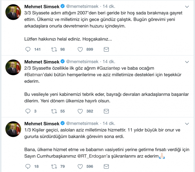 Milletvekili adayı olarak gösterilmeyen ve yeni kabinede yer almayan Eski Başbakan Yardımcısı Mehmet Şimşek 11 yıldır sürdürdüğü bakanlık görevine şu sözlerle veda etti: