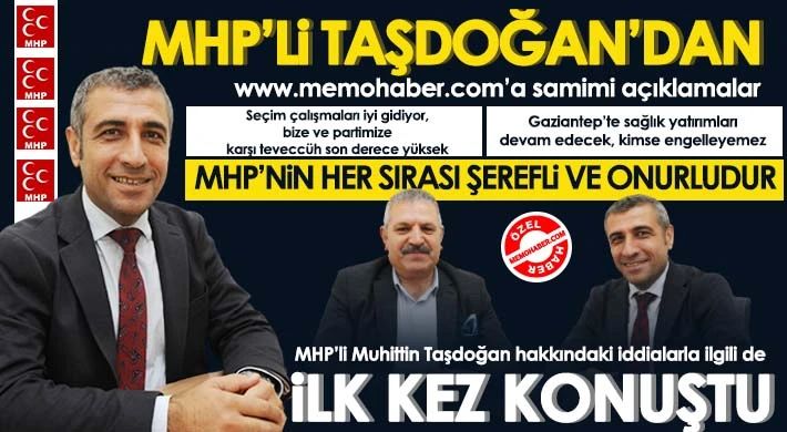 Milliyetçi Hareket Partisi (MHP) Gaziantep Milletvekili ve yeni dönemde de üçüncü sıradan milletvekili adayı olan Ali Muhittin Taşdoğan, pek çok konuda www.memohaber.com’a çok özel açıklamalar yaptı. MHP Gaziantep Milletvekili ve üçüncü sıradan milletvekili adayı olan Ali Muhittin Taşdoğan, www.memohaber.com Genel Yayın Yönetmeni Mehmet Taşçı’ya yaptığı açıklamalarda seçim çalışmalarından hakkındaki iddialara ve geride bırakılan 5 yıllık vekillik dönemine ilişkin birbirinden özel açıklamalarda bulundu.
